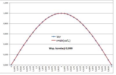 linii $\overline v $ ugięcia unormowanego:  $\overline  v_{cr}^”\approx \cfrac{0,9951-2\cdot 1,0000+0,9951}{0,1875^2}=- 0,2766 \, 1/m^2$