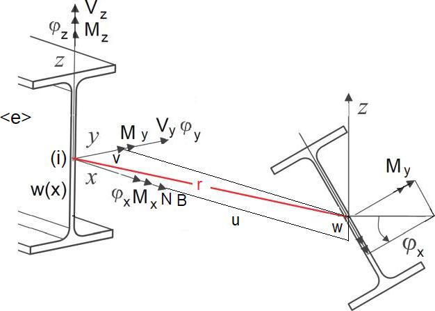 $$\begin{equation}  N(x) = – EA \cdot u'(x) \quad ; \quad M_y(x) =- EI_y \cdot w”(x) \quad ; \quad M_z(x) = – EI_z \cdot v”(x) \quad ; \quad B(x)= – EI_\omega \cdot {\varphi_x}” (x) \label {3-8.3}  \end{equation}$$