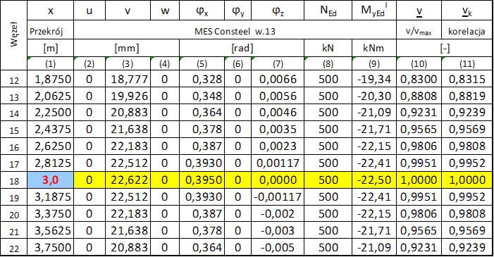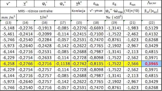 W kol. (22) zestawiono wartości mnożnika sił przekrojowych $\Lambda_{cr,tot}$ obliczonego ze wzoru ($\ref{3-8.9}$) dla $\beta_m= 1,017 \cdot 10^{-3}$  zgodnie z ($\ref{3-8.10}$).