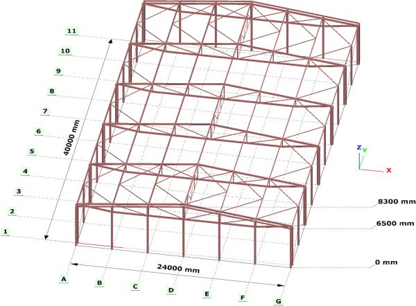 - Układ poprzeczny hali [słupy, wiązar] w płaszczyźnie pionowej poprzecznej. Układ przenosi podstawowe obciążenia pionowe i obciążenie wiatrem z kierunku bocznego (parcie na jeden słup i ssanie na drugi), a także wymuszenia od imperfekcji geometrycznych w płaszczyźnie układu poprzecznego.