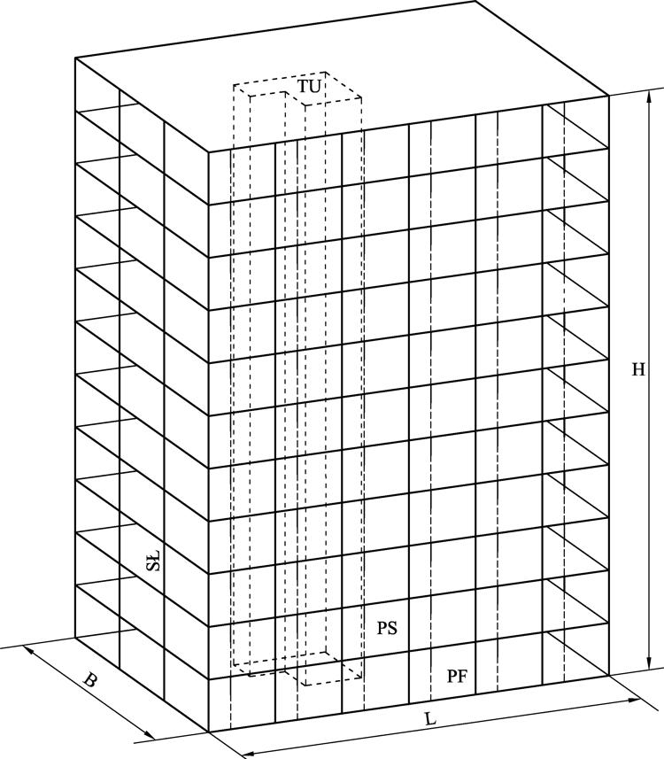 Rys. 3-7.5. Schemat żelbetowego budynku wielokondygnacyjnego z trzonem usztywniającym TU , płytą fundamentową PF oraz elementami usztywnianymi: słupami SŁ i płytami stropowymi PS (opracowanie własne)