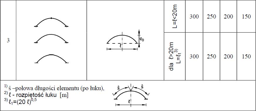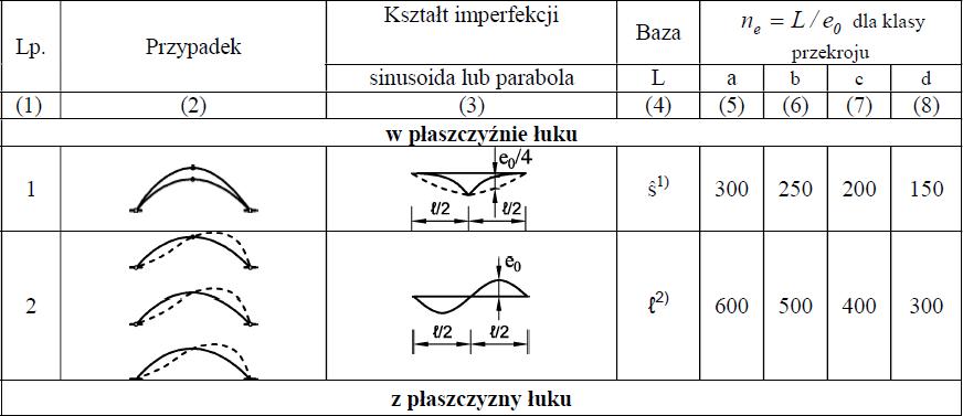 Tab.3-6.1 Kształt i amplitudy imperfekcji projektowych łuków $n_p=\tfrac{L}{e_0}$ [1]