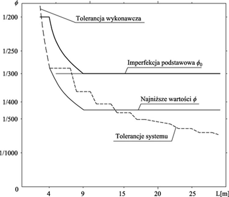 Dopuszczalne tolerancje konstrukcji, są odwzorowane na wartości imperfekcji projektowych. Ścisłą korelację zauważono w komentarzu [5] do PN-EN 1992-1+AC+Ap 1,2,3: 2008, Projektowanie konstrukcji z betonu, Część 1-1: Reguły ogólne i reguły dla budynków, co przedstawiono na rys. 2-2.3. Porównano projektowe imperfekcje przechyłowe zalecane przez [6], z tolerancjami konstrukcji żelbetowych w 1 klasie wykonania (samokontrola lub inspekcja z procedurami jednostki bez specjalnych procedur odbiorczych). Przyjęto, że wartość podstawowej imperfekcji pochylenia wynosi 1/300 wyznaczono jako średnią z 1/200 dla konstrukcji wrażliwych i 1/400 dla niewrażliwych na efekty drugiego rzędu). Z porównania wynika, że istnieje ścisła korelacja tolerancji wykonania z imperfekcjami projektowymi.