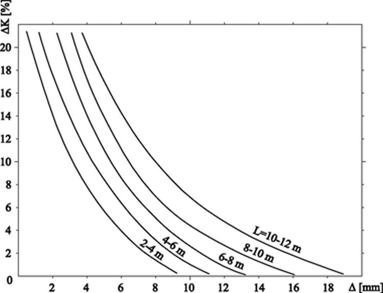 Tolerancje ustanowione w przepisach dotyczą odchyłek, wymagających normalnej staranności od Wykonawcy. Jeśli potrzebne są większe wymagania, to odpowiednie zalecenia powinny być przedstawione w specyfikacji wykonania i odbioru, opracowanej przez Projektanta. Należy zwrócić uwagę, że nadmierne zwiększenie wymagań nie jest ekonomicznie uzasadnione, bowiem zwykle prowadzi do nieproporcjonalnego zwiększenia kosztów. Na rys. 2.4 pokazano przyrost kosztu budowy wygenerowany koniecznością dotrzymania tolerancji $\Delta$ [mm] konstrukcji żelbetowej budynku na długości bazy L [m] . Bazę można interpretować, jako wysokość budynku, a tolerancję Δ jako dopuszczalne odchylenie od pionu przed obciążeniem. Dla porównania zgodnie z [1] normalne tolerancje dla bazy L [m] w konstrukcji określono na $\Delta= \pm 4 \sqrt{L} \,mm$.
