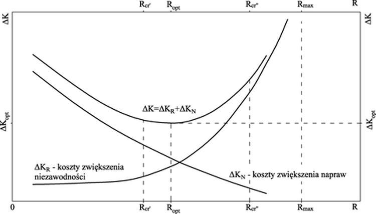 Z rys. 2-2.2 wynika, że konstrukcje budowlane są naprawialne, więc w celu ustalenia optymalnych wartości tolerancji należy wziąć pod uwagę nie tylko koszty inwestycyjne $\Delta K_I$ zwiększenia jakości budowli poprzez zawężenie tolerancji jej wykonania, ale również koszty awarii $\Delta K_A$ związanych z postojami, serwisem, utrzymywaniem gotowości gwarancyjnej, a także kosztami konsekwencji awarii (w tym życia i zdrowia użytkowników obiektu). Wyznaczenie punktu optimum niezawodności $R_{opt}$ systemu z warunku sumarycznych kosztów inwestycyjnych $\Delta K_I \approx \Delta K_R$ oraz eksploatacji $\Delta K_N$ jest możliwe w drodze pogłębionej analizy systemu konstrukcyjnego w całym okresie jego życia. Krytyczne wartości niezawodności $R_{cr}$ wynikają z wymogów bezwzględnych: $R_{cr}’$ – minimalna wartość niezawodności, akceptowana społecznie, najczęściej wpisana do norm: $R_{cr}”$ – maksymalna wartość niezawodności wykraczająca poza potrzeby społeczności, regionu i państwa , wynikająca z polityki gospodarczej i społecznej.