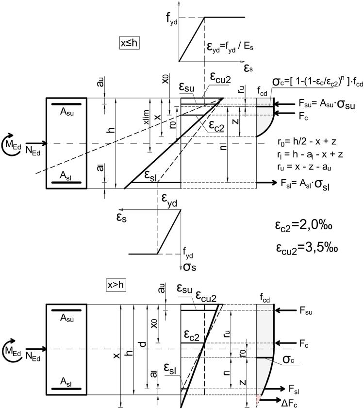 \Sigma M_0  :  M_{Ed} = M_{c,0} + F_{su} \cdot (d_0 – a_u) + F_{sl} \cdot (d_0 – a_l)