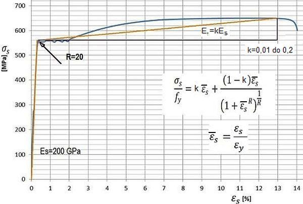 Model $(\ref{s_s})$ upraszcza obliczenia numeryczne i dokładniej oddaje rzeczywiste zachowanie stali zbrojeniowej, szczególnie w zagadnieniach obciążeń zmiennych, gdzie istotny jest efekt Baushingera, a także uwzględnia wzmocnienie stali w zakresie plastycznym. Z analizy eksperymentalnie uzyskanych charakterystyk stali B500 (rys.2) wynika, że parametr wzmocnienia  k=(0,01÷0,2). Dla betonu B500 $\varepsilon_{yk}=f_{yk}/E_s=500/200=$ 2,5‰.  W zależności od klasy plastyczności   minimalne  odkształcenia stali zbrojeniowej  $\varepsilon_{uk}$ [1],Tab.C.1 i wynikające stąd współczynniki pochylenia półki plastycznej $k$ wynoszą: