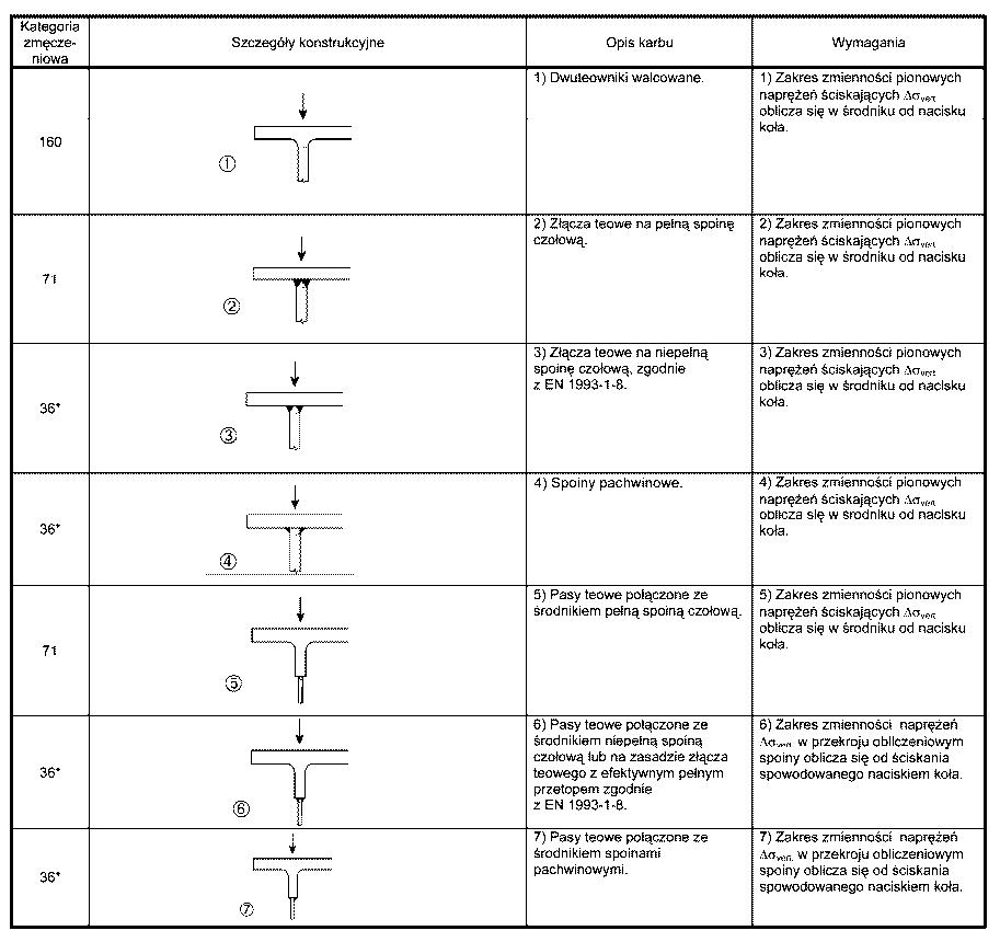 W tabeli 1 zestawiono dla przykładu kategorie zmęczeniowe styków górnych pasów ze środnikiem w belkach podsuwnicowych.