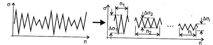 W przypadku widma o nieregularnej zmienności naprężeń (tzw widma niejednorodnego) norma zaleca zastosowanie jednej z technik zliczania cykli w celu zamiany takiego widma na równoważny mu zbiór widm jednorodnych(rys.2).