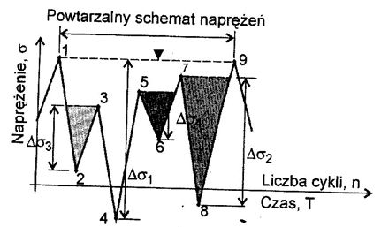 Spuszczenie wody z najniższego punktu (pkt 4 na rys wyżej) odpowiada zliczeniu jednego pełnego cyklu obciążenia o zakresie $\Delta \sigma_i$. W podobny sposób w kolejnych krokach „opróżnia się” wodę z pozostałych fragmentów zbiornika, w których jeszcze pozostała, znajdując za każdym razem najniżej położony punkt wykresu. Pozwala to na zliczenie kolejnych zakresów zmienności obciążenia $\Delta \sigma_i$, liczonych jako różnica pomiędzy obecnym poziomem spuszczanej wody, a poziomem „otwieranego” korka. Liczba cykli obciążeń n , odpowiadająca danemu zakresowi zmienności $\Delta \sigma_i$, jest liczbą „wyciągnięć korka”. Procedurę tą powtarza się, aż do całkowitego „opróżnienia” zbiornika. Najważniejszą zasadą opisanej procedury jest opróżnianie i zliczanie w pierwszej kolejności zbiorników, w których występuje największa wysokość słupa wody, czyli największy zakres naprężeń. Wyznaczając całkowitą liczbę cykli obciążeń odpowiadającą rozpatrywanemu rozpatrywanemu zakresowi naprężeń $\Delta \sigma_i$,, trzeba również uwzględnić ile razy analizowany schemat obciążenia powtarza się podczas eksploatacji konstrukcji.