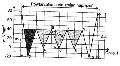 Mamy zarejestrowaną (lub wyznaczoną analitycznie) historię naprężenia w elemencie pokazana na rys.4. Pokazana sekwencja jest powtórzona $1,1 \cdot 10^5$ razy w całym okresie użytkowania obiektu.