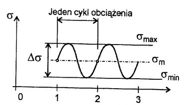 Najprostszym przykładem zmienności naprężeń jest widmo jednorodne, czyli widmo naprężeń o stałej amplitudzie , które jest charakteryzowane wartościami naprężeń maksymalnych $\sigma_{max}$ oraz minimalnych $\sigma_{min}$ w poszczególnych cyklach , oraz zakresem zmienności (amplitudą). Zakres zmienności naprężeń (normalnych $\sigma$ oraz stycznych $\tau$ przyjmuje się jako algebraiczną różnicę maksymalnego i minimalnego naprężenia w rozpatrywanym punkcie konstrukcji, a naprężenie średni jako średnią arytmetyczną tych naprężeń (rys.1)