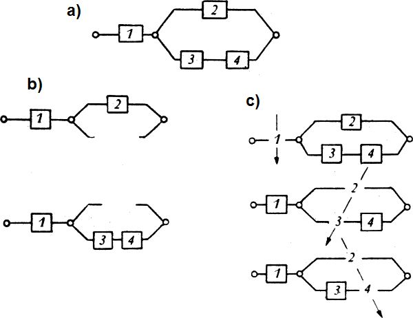 System z rys. 9a ma następujące ścieżki zdatności systemu: {1,2,3,4}, }{1,2,3}, {1,2,4}, {1,2}, {1,3,4}, , z których dwie ostatnie (pogrubione) są ścieżkami minimalnymi, pokazanymi na ry. 9b). Cięcia systemu, to: {1,2,3,4}, {1,2,3}, {1,2,4}, {2,3,4}, {1,2}, {1,3}, {1,4}, {2,3}, {2,4}, {1}, z których trzy ostatnie (pogrubione) są cięciami minimalnymi.