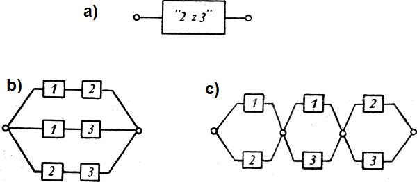 Istnieje szereg struktur niezawodnościowych, których nie da się przedstawić za pomocą schematu blokowego, czyli nie jest strukturą szeregowo równoległą lub równoległo szeregową. Takie struktury nazywa się progowymi. Przykład struktury progowej „2 z 3” pokazano na rys. 10, Struktura progowa „2 z 3” oznacza , że system jest w stanie zdatności, gdy spośród trzech jego elementów przynajmniej dwa są w stanie zdatności.