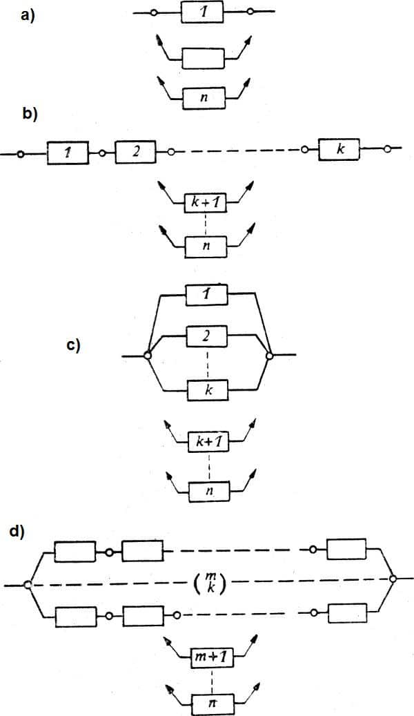 Rys.11. Struktura progowa uogólniona: a) typowa struktura rezerwy nieobciążonej, b) struktura szeregowa, c) struktura równoległa, d) struktura „k z n” (opis w tekście) [2],rys.3.22
