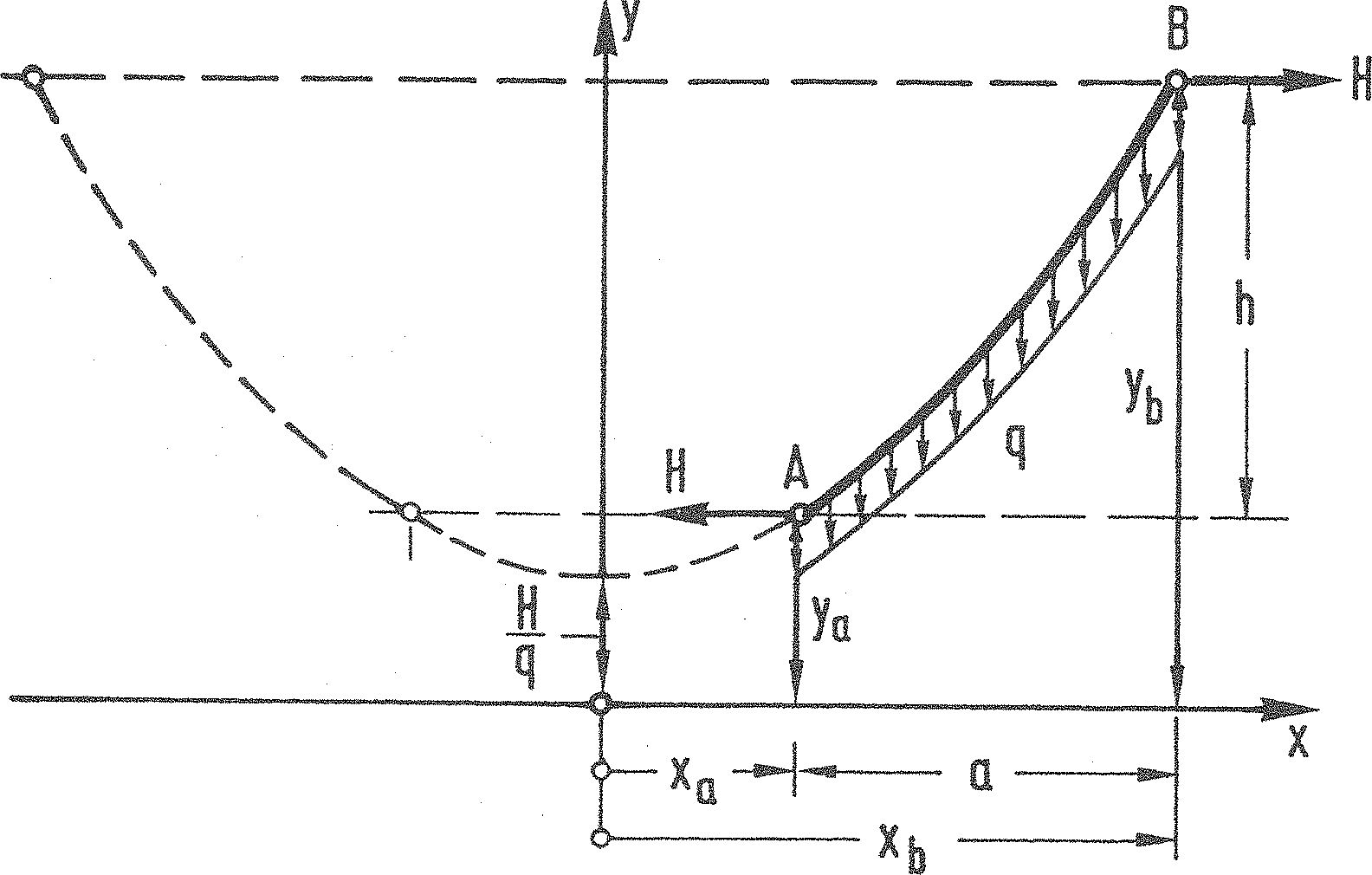 $ y=\dfrac{H}{q}\cdot \left ( cosh \dfrac{x_b}{H/q}- cosh \dfrac{x_a}{H/q}\right )=\dfrac{2H}{q}\cdot sinh \dfrac{x_b+x_a}{2H/q}\cdot sinh \dfrac{x_b-x_a}{2H/q}$ $=\dfrac{2H}{q}\cdot sinh \dfrac{a}{2H/q}\cdot sinh \dfrac{a+2x_a}{2H/q}$, |