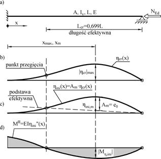 gdzie $ A_m$ jest zastępczą (równoważną, alternatywną) amplitudą imperfekcji, podczas gdy $\overline \eta_{cr}(x)$ jest funkcją postaci wyboczenia elementu unormowaną w taki sposób, że jej amplituda jest jednostkowa $|\overline \eta_{cr,max}|=1$. Z wielu postaci wyboczenia systemu należy stosować najniekorzystniejszą, którą najczęściej jest pierwszą postacią wyboczenia [15] , [16] .