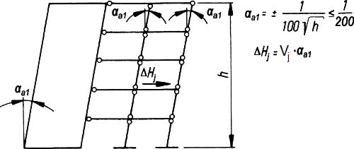Na rys. 6 pokazano istotę problemu imperfekcji przechyłowych. Na skutek przechyłu budynku o kąt $\alpha_{a1}$ , który dla wysokich budynków należy przyjmować o wartości podstawowej