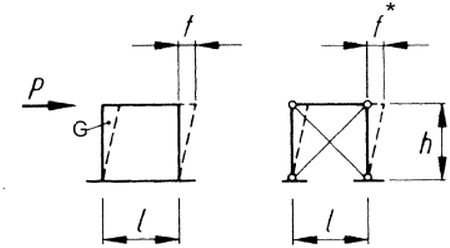 Ramę zastępczą dobieramy w rozwiązaniu zadania zstępczego z warunku równości ugięć sprężystych pod poziomym obciążeniem P (dowolnym) ściany $f$ i ramy $f*$.