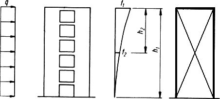 Dobór zastępczej ramy dla ściany z otworami polega na numerycznym rozwiązaniu zadania pomocniczego: dobrać pręty ramy zastępczej tak, by pod obciążeniem poziomym $q$ przemieszczenia ramy były zgodne z przemieszczeniami traczy-ściany z otworami (rys.9). Wymaga się by zgodność dotyczyła przemieszczeń $f_1$ i $f_2$ na dwóch poziomach, na przykład dla $h_1=h$ i $h_2= h/2$. Ze względu na powszechną dostępność programów obliczeniowych oraz wiele zmiennych parametrów, które można kontrolować – nie podaje się wzorów analitycznych.