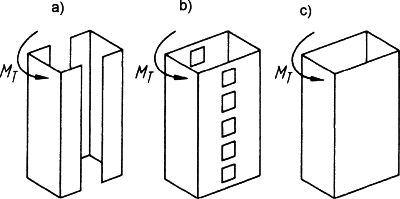 Sztywność na skręcanie wyznacza się dla przypadku obciążenia momentem skręcającym $M_T$. Najmniejszą sztywność ma przekrój otwarty rys. 10a, a największą zamknięty rys. 10c. Charakterystyki trzonu o przekroju zamkniętym można obliczyć wg zależności podanych w artykule
