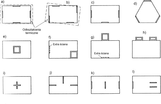 Przykłady ukształtowania elementów budynku w celu zachowania stateczności w planie, pokazano na rys. 3, z których 3 f,g,i,j,k, l są rozwiązaniami błędnymi z warunku stateczności przestrzennej budynku.