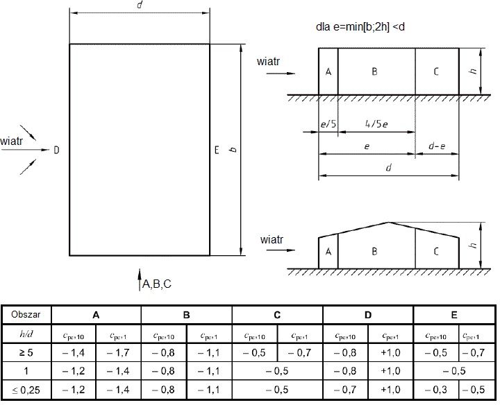 Rozkład wiatru po wysokości można przyjmować zgodnie z rys. 4. Rozróżnia się dwa przypadki zależnie od stosunku wysokości $h$ do jego szerokości $b$. W każdym z nich – przy podstawie budynku do wysokości równej szerokości b przyjmuje się stałe oddziaływanie równe obciążeniu na wysokości b. W pierwszym przypadku na pozostałej powyżej, a w drugim przypadku tylko przy wierzchołku na wysokości równej $b$ przyjmuje się przyjmuje się stałe oddziaływanie równe obciążeniu na wysokości h. W odcinku pośrednim dla drugiego przypadku obciążenia stopniuje się plasterkami o grubości $h_j$. Wiatr działa na wszystkie ściany jednocześnie, tak jak pokazano na rys. 5 Dla budynku wysokiego zaleca się przyjmować współczynnik ciśnienia $C_{pe,10}$ na powierzchnię referencyjna 10 m2, a nie $C_{pe,1}$