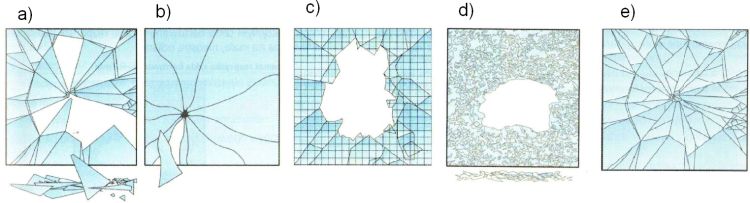 Rys. 7 . Schematy rozprysku szkła: a) surowe float, b) wzmocnienie termiczne, c) zbrojone, d) hartowne, e) laminowane