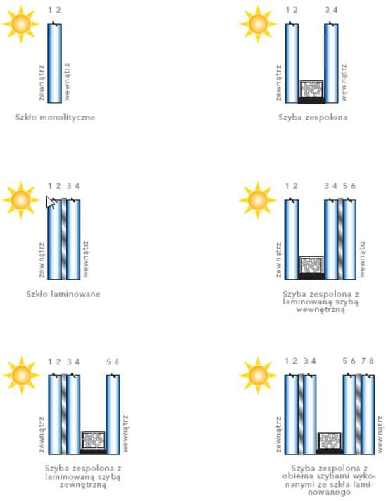 Na rys. 11 przedstawiono najpopularniejsze konfiguracje stosowanych szyb z oznaczeniem ich poszczególnych powierzchni szklanych numerami odpowiadającymi ich miejscu w kolejności licząc od zewnątrz do wewnątrz.