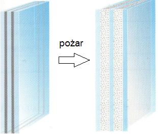 Zasadę działania szkła laminowanego z warstwami pęczniejącymi pokazano na rys. 8. W rekcji na ogień warstwy wewnętrzne pęcznieją, tworząc barierę chroniąca przed ogniem. W normalnych warunkach warstwy wewnętrzne szkła umożliwiają przenikanie światła przez taflę. Natomiast w przypadku pożaru rozszerzają się i zamieniają w sztywną , nieprzejrzystą i pochłaniającą ciepło osłonę ogniową. Im większa liczab warstw tym wiesza ochrona cieplna. W praktyce uzyskuje się szkło o odporności EW 30 do EW 60 , a nawet do EI 120.