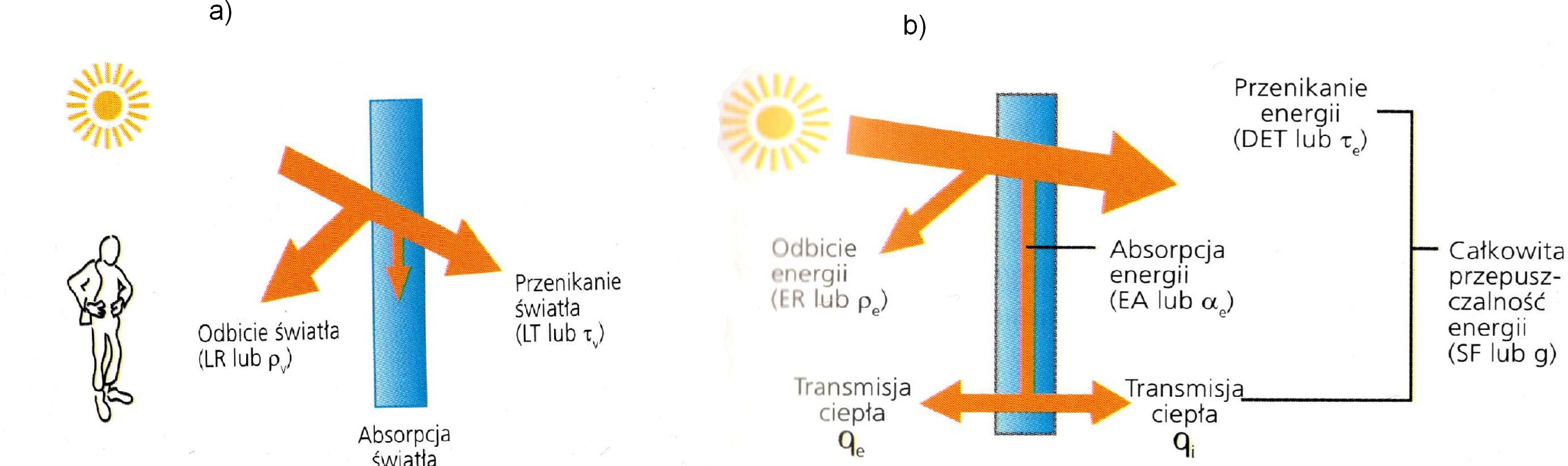 Na rys. 1 pokazano schemat zjawiska przepuszczalności oraz przenikania energii. Współczynnik przenikania światła $\tau_v$ (LT czyli transmisyjność) oraz odbicia $\rho_v$ (LR czyli refleksyjność) odnosi się tylko do widzialnej części widma słonecznego ( pomiędzy 380 a 780 nm) i określa odpowiednio cześć światła widzialnego przepuszczonego i odbitego przez szybę. Promieniowanie pochłonięte przez szybę nie jest widoczne i nie bierze się go pod uwagę. Energia słoneczna przenika do wnętrza pomieszczenia $g$ (lub SF) poprzez transmisję bezpośrednią $\tau_e$ (lub DET) oraz emisję wtórną $q_i$, $g=\tau_e +q_i$.