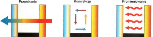 Ciepło przenika przez szybę w wyniku trzech standardowych procesów, zobrazowanych na rys.3: