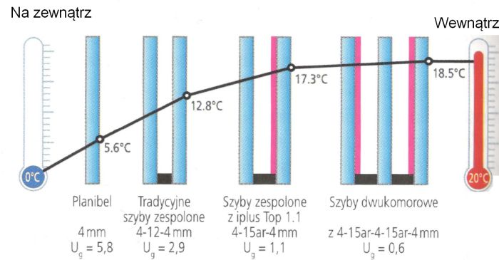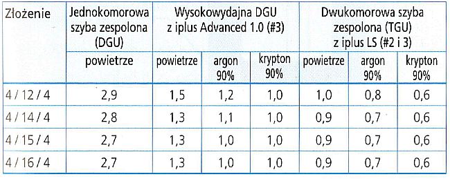 W tab. 1 podano wartości współczynnika przenikania ciepła dla różnych rodzajów szyb izolacyjnych. Współczynnik jest wyznaczamy w centralnym punkcie szyby, tj. z wyłączeniem efektu mostka termicznego obrzeżach szyby, polegającego na stratach ciepła na skutek kontaktu z ramką dystansową i ramą.
