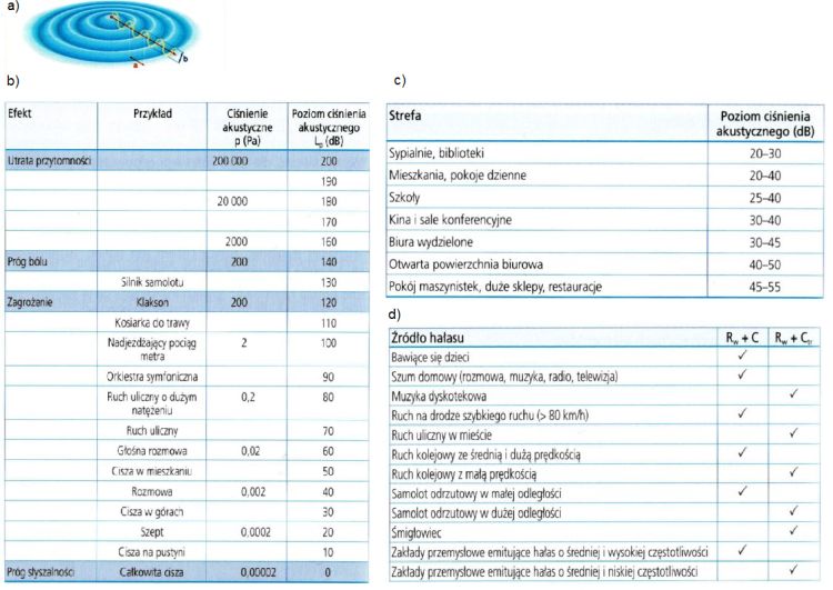 Rys.9: a)częstotliwość a i natężenie b, b) ciśnienie akustyczne i poziom ciśnienia w przykładach, c) maksymalne wartości ciśnienia akustycznego w pomieszczeniach, d) dobór wskaźnika adaptacyjnego dla obliczenia wartości jednoliczbowego wskaźnika izolacyjności akustycznej w zależności od źródła hałasu