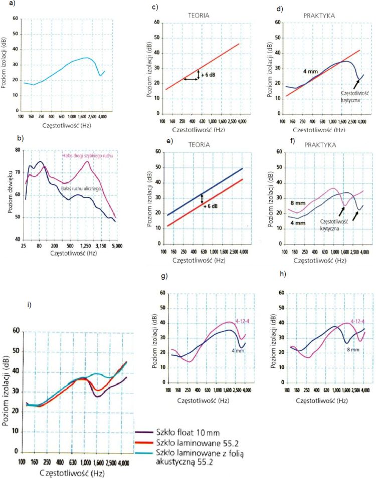 Rys. 10. Widma dźwięku: a) przykład zwykłego dźwięku, b) hałas zewnętrzny, c), d) prawo częstotliwości w teorii i praktyce, e), f) prawo masy w teorii i praktyce, g), h) porównanie widma dla szyby zespolonej 4-12-4 z szyba pojedynczą 4 mm oraz 8 mm, i) widma izolacyjności dla szyby pojedynczej 10 mm oraz szkła laminowanego oraz z folią akustyczną 55,2