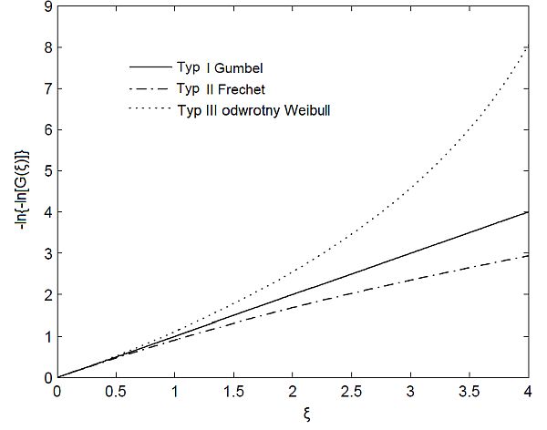 Na rys.1. pokazano wszystkie trzy ekstremalne rozkłady wartości jako funkcję wartości zmiennej X od przekształconej dystrybuanty -ln(-ln(G(ξ))). Parametry kształtu $\gamma$ dla rozkładu Frechéta i odwrotnego rozkładu Weibulla przyjęto odpowiednio 0,2 i -0,2. Rozkład Gumbela jest linią prostą, odwrotny rozkład Weibulla jest wklęsły (ma krzywiznę w kierunku prawego punktu końcowego rozkładu), a rozkład Frechét jest wypukły i leży poniżej prostej Gumbela.