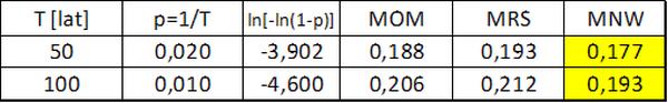 W kol. (8) podano unormowany argument dystrybuanty, a w kol(9) prognozę dystrybuanty Gumbela dla wyznaczonych parametrów metodą MOM. W kol (10) podano błąd oszacowania err_i= kol. (8)-(7), a w podsumowaniu tej kolumny podano błąd średniokwadratowy $ \sum err^2 = 0,186$, będący miarą dobroci dopasowania rozkładu.