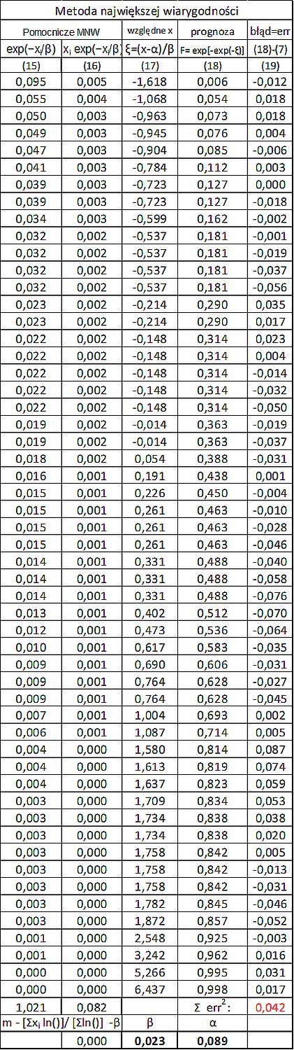 W tym celu należy sporządzić dwie kolumny pomocnicze: (15) $ \left [ e^{ \tfrac{-x_i}{\beta}} \right ] $ oraz (16) $ \left [ x_i \cdot e^{ \tfrac{- x_i}{\beta}} \right ] $ , gdzie za $\beta$ należy wskazać dowolna komórkę, przeznaczoną do zmian, a w podsumowaniu kolumn obliczyć sumę tych wielkości.