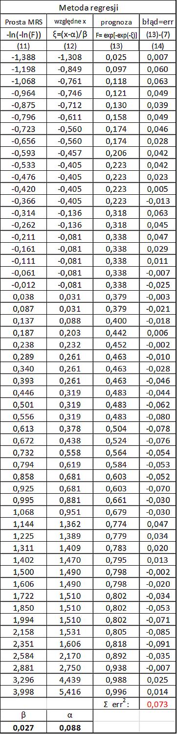 Obliczenia metodą regresji zestawiono w tab. A.5b, będącej kontynuacja tab. A.5a. W kol. (11) zestawiono wartości „x= -ln(ln(F))”. Następnie metodą kwadratów wyznaczono liniowy trend pomiędzy wartościami $q_{p}$ (kol (6) tab. A.5a) a wartościami z kol (11) tab. A.5b. Trend ma równanie $q_p=0,099 x – 0,263$. Współczynnik kierunkowy tej prostej jest właśnie parametrem $\beta$, a wyraz wolny parametrem $\alpha$. W kol. (13) podano prognozę dystrybuanty z wzoru ($\ref{A.19}$), a w kol. (14) błąd średniokwadratowy aproksymacji $\sum err^2 = 6,384$