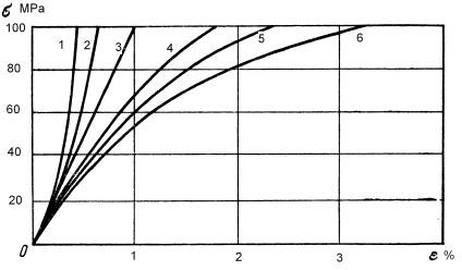 Rys.2. Krzywe odksztalceń, uzyskane dla tych samych pomiarów, ale innych definicji odkształcenia: 1- Almansi, 2- Koerber- Schaiger , 3 -Hencky, 4-Couchy, 5-Kun, 6-Green [1]