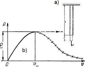 Podczas badań ze sterowaniem siłą, zadaje się wzrost siły z określoną prędkością. Po osiągnieciu wartości siły $ P_cr $ dalszy jej wzrost jest już niemożliwy – długość pręta rożnie bez przyrastania siły. To znaczy, że opadająca gałąź ścieżki równowagi, poprzekreślana na rys.1 – nie jest osiągana – przedstawia stany niestateczne. Wartość siły przy której nastąpi krytyczny stan otrzymujemy z warunku $\dfrac {dP}{dv}=0$, czyli: