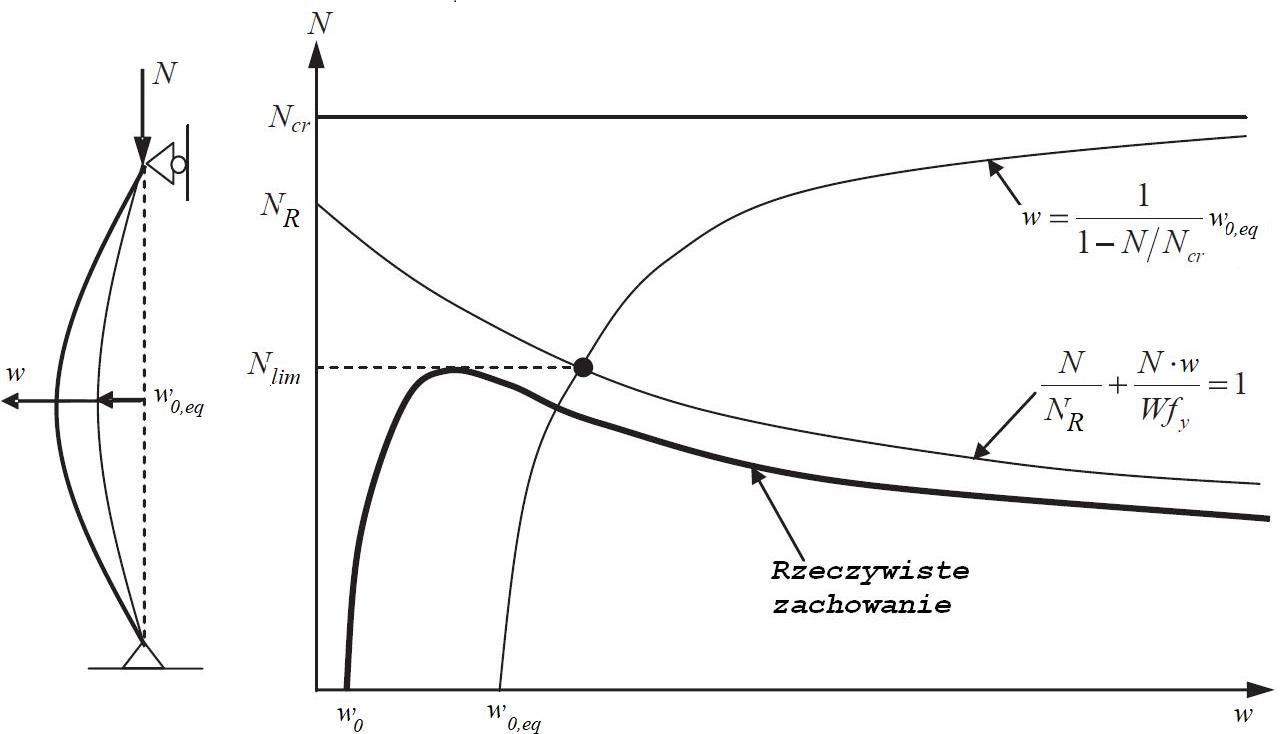 Na rys. 2-3.18 pokazano ilustrację zagadnienia ściskania rzeczywistego pręta w nomenklaturze przyjętej w pracy [zotpressInText item=”{XZT6QNPE}”]. Nośność $N_R$ jest nośnością przekroju na czyste ściskanie. Natomiast $N_{cr}$ jest nośnością pręta (Eulera). Definiuje się następujące mnożniki obciążenia $N$: